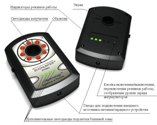 Пользоваться прибором очень легко. Необходимо всего лишь включить детектор и осмотреть всё пространство помещения через экран встроенного объектива.