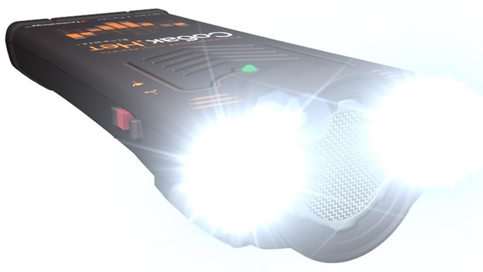 Встроенные светодиодные стробоскопы позволяют при необходимости использовать отпугиватель как яркий фонарик. Прибор переводится в режим фонарика с помощью переключателя на правой боковой стороне корпуса. Света двух мощных светодиодов вполне хватит, чтобы осветить Вам дорогу в темноте, помочь в поиске упавших ключей и т.д.
