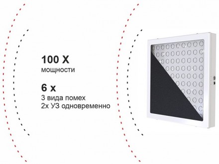 • 100 мощных ультразвуковых излучателей. Такое большое количество излучателей генерирует максимально "плотный" ультразвуковой сигнал, способный оказывать воздействие на записывающие тракты шпионских приспособлений с расстояния в 10 м, наибольший же эффект обеспечивается на дистанции до 4 м. Угол распространения помехи составляет 180°.