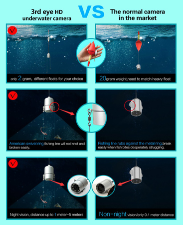 Суперлегкая (всего 2 грамма!) миниатюрная видеокамера для рыбалки с разрешением 2 Мп, транслирующая видео через комплектный Wi-Fi-модуль на мобильное устройство на базе Android или iOS. Снабжена широкоугольным (140°) объективом, сохраняет водонепроницаемость на глубине до 30 м, имеет 8 ИК-светодиодов для качественной съемки в мутной воде и в ночное время. Поддерживается сохранение видео на карту памяти MicroSD. Питается от емкого (на 1300 мАч) аккумулятора, заряда которого хватает на 3 часа работы. В комплекте идет специальный кронштейн, поплавок, катушка и 9 силиконовых колец для фиксации кабеля на спиннинге.